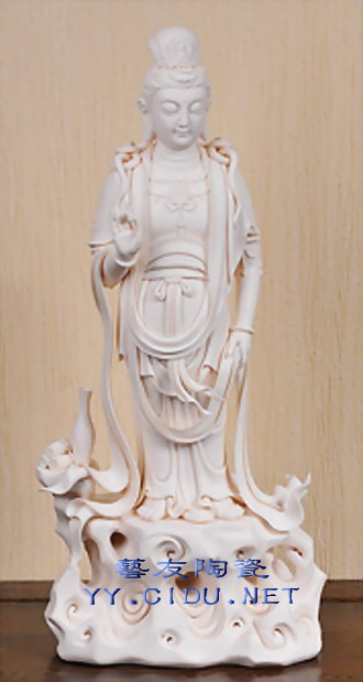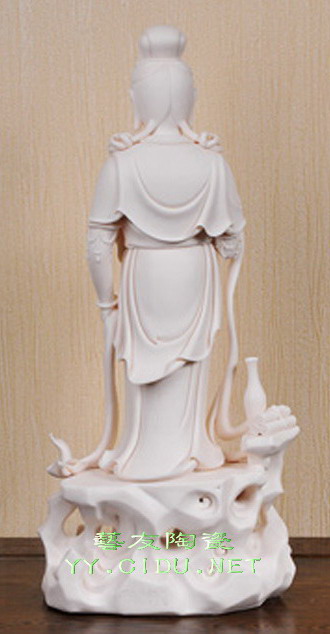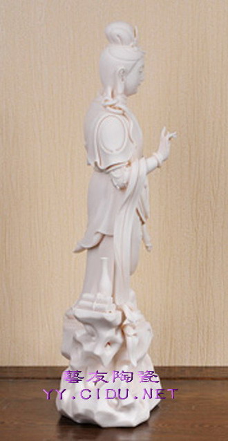 此尊观音像是为瓷制品,人物作站立状, 立于岩石上,做工精美,设计精巧。