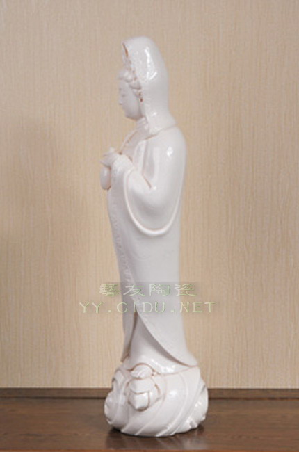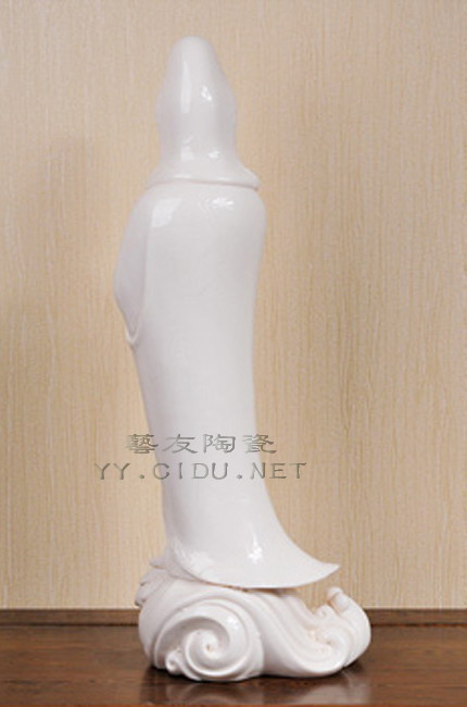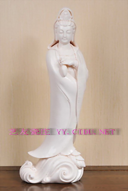 观音像成乳白色,脚踏着卷卷浪花优雅地在海面上前行,慈祥端庄。